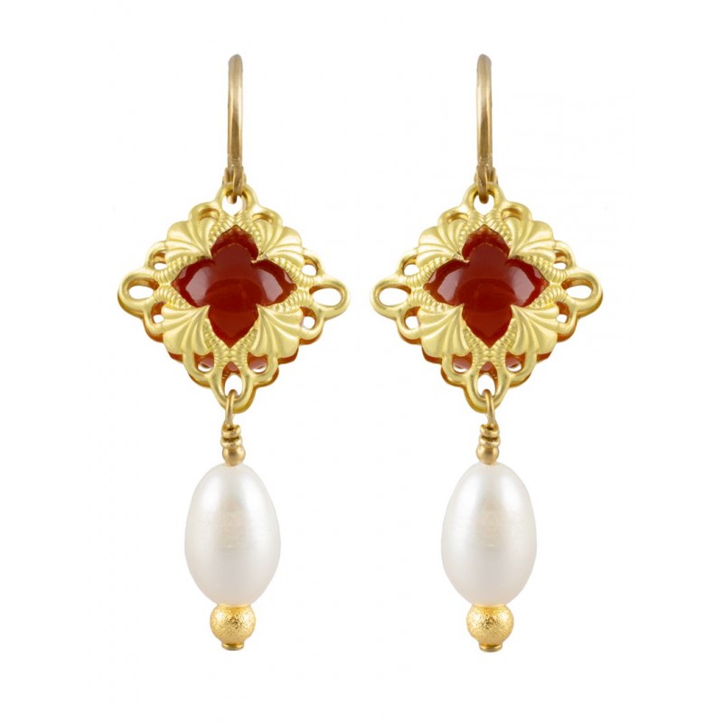 Spanien wird als schöne Matrone dargestellt, die eine klassische Kleidung trägt und eine Lanze hält. An ihren Ohren sehen wir wunderschöne Ohrringe, die sowohl klassisch als auch modern sind und die wir hier nachgebildet haben. Sie sind aus Messing, Natursteinen und Flussperlen gefertigt.