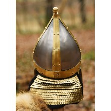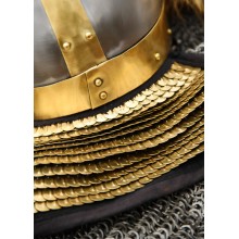 Auf Darstellungen der Bogenschützen ist dieser Helmtyp oft zu erkennen. Er war zudem mit einem Nackenschutz versehen – entweder aus gehärtetem Leder, Kettengeflecht oder wie in diesem Fall aus kleinen Metallschuppen, die auf einem Lederuntergrund angebracht sind.