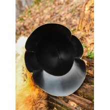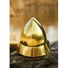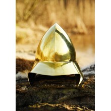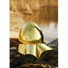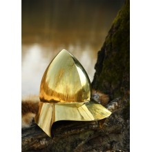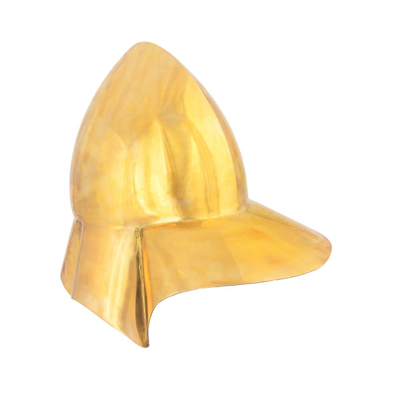Dieser boeotische Helm ist eine einteilige Nachbildung aus 1,2 mm dickem Messingblech (Kaliber 18). Das Innere ist nicht ausgekleidet, aber mitgeliefert wird eine gepolsterte Baumwollkappe, die den Helm für historische Nachstellungen sehr bequem macht.