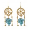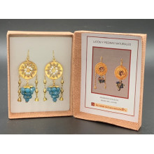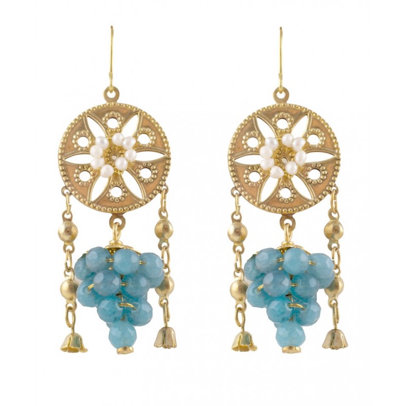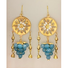 Hier bieten wir eine Replik wunderschöner etruskischer Ohrringe an, deren Originale derzeit im Louvre-Museum in Paris ausgestellt sind (siehe Bild unten). Sie bestehen aus einer zentralen Scheibe aus Messing und Perlen, mit doppeltem seitlichem Fall und einer Traube aus natürlichen blauen Steinen.