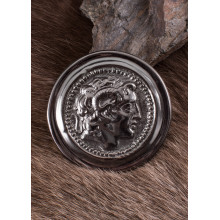 Diese Nachbildung einer römischen Phalera ist aus Messing gegossen und zeigt das Abbild Alexanders des Großen mit den sogenannten Ammonshörnern. Sie ist in zwei verschiedenen Farben erhältlich: Gold (Messing) oder Silber (versilbertes Messing). Diese Messing-Phalera eignet sich perfekt für Ihr eigenes Geschirrprojekt oder als Einzelstück bzw. Ersatzteil.