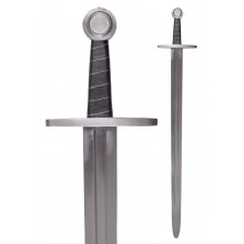 Das Schwert ist komplett handgefertigt. Kreuzgriff und Knauf sind aus weichgegossenem Eisen, wärmebehandelt, die elastische Klinge ist ölgehärtet auf ca. 48 HRC, durch den Knauf geführt und dort vernietet. Der Griff ist mit Leder umwickelt. Die tiefe Hohlschliff-Rinne sorgt für hohe Elastizität und geringes Gewicht. Die Klingen- und Schneidkanten sind nicht geschärft.
