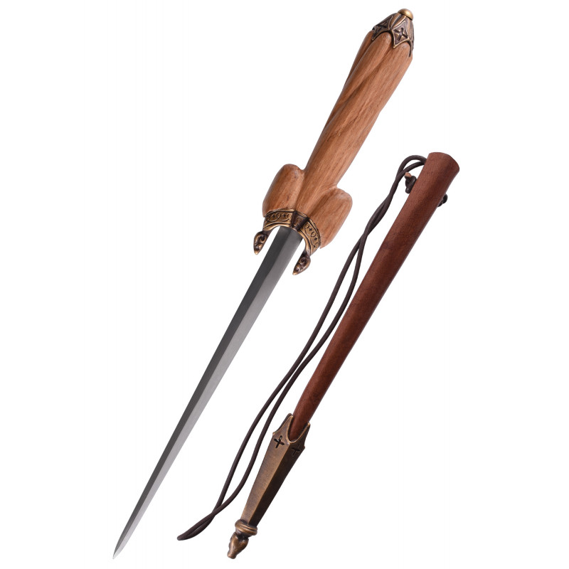 Diese schöne und elegante Nachbildung eines deutschen Dolches aus dem 16. Jahrhundert verfügt über eine Klinge aus elastischem EN45-Stahl mit diamantförmigem Querschnitt, die gleichmäßig bis zu einer scharfen Spitze zuläuft. Die Schneiden sind nicht geschärft, und die durchgehende Angel ist mit dem Knauf verschraubt. Der Griff mit dem charakteristischen gelappten Parier ist aus einem Stück Holz geschnitzt und mit patinierten Messingbeschlägen verstärkt: ein mit Kreuzen verzierter Abschluss und ein nach unten geneigter Parier mit ebenfalls dekorativen Widderkopfenden.