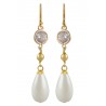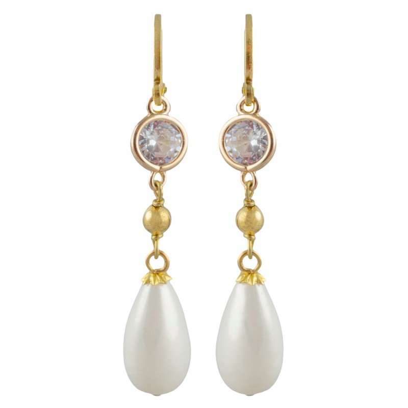 Zwar sind die Ohrringe auf dem Stich nur schwer zu erkennen, doch zieren sie deutlich ihre Ohren: Gold mit rundem Diamant und hängender Tropfenperle – das Design, das wir hier originalgetreu nachgebildet haben.