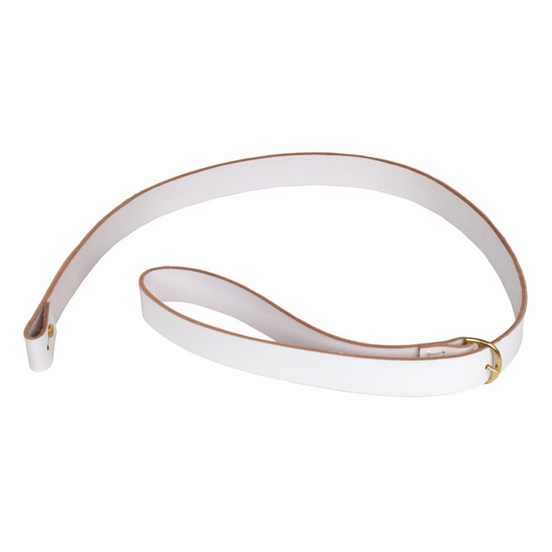 Dies ist eine Replik des Gewehrriemens für das spanische Modell 1757–1801. Wie die vorschriftsmäßigen Originale ist er aus weiß gefärbtem Rindsleder gefertigt und mit einer Messingschnalle zur Regulierung der Länge ausgestattet.
