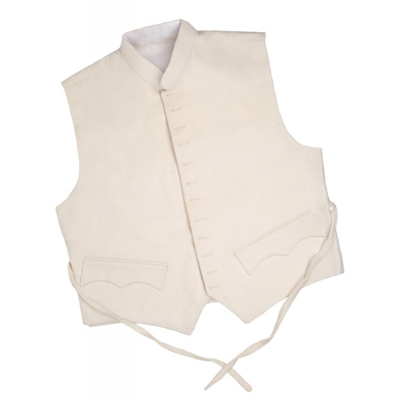 Dieses Modell ist aus weißer Wolle gefertigt und mit weicher Baumwolle gefüttert. Es handelt sich um die Variante mit Stehkragen, wie sie für Offiziere oder bestimmte Truppenteile typisch war. Die Knopflöcher sind bereits eingearbeitet, die Knöpfe jedoch nicht, damit der Reenactor die für sein Korps oder Regiment passenden anbringen kann.
