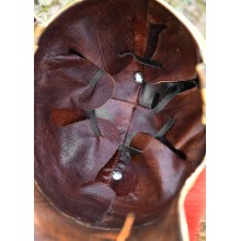 Die Wangenklappen besitzen innen eine durchgehende Öse, um den Kinnriemen mit dem beiliegenden Lederband zu befestigen und anzupassen.
