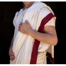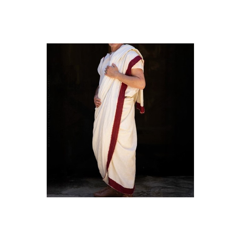 Die Toga ist wohl das charakteristischste Kleidungsstück der Römer. So sehr, dass ihr Gebrauch Nichtbürgern verboten war, um sie den echten Römern vorbehalten zu lassen. Ihr Gebrauch reicht praktisch von den Anfängen der Stadt bis weit ins Spätimperium hinein. Diese Bedeutung war so groß, dass Senatoren verpflichtet waren, sie bei Senatssitzungen zu tragen, und sie sogar dazu diente, die Position eines Mannes im Senat zu kennzeichnen. In diesem Fall, wie auf den Bildern zu sehen, hat die Toga einen purpurfarbenen Saum, der anzeigt, dass es sich um einen Senator handelt, der eines der höheren Magistrate bekleidet.