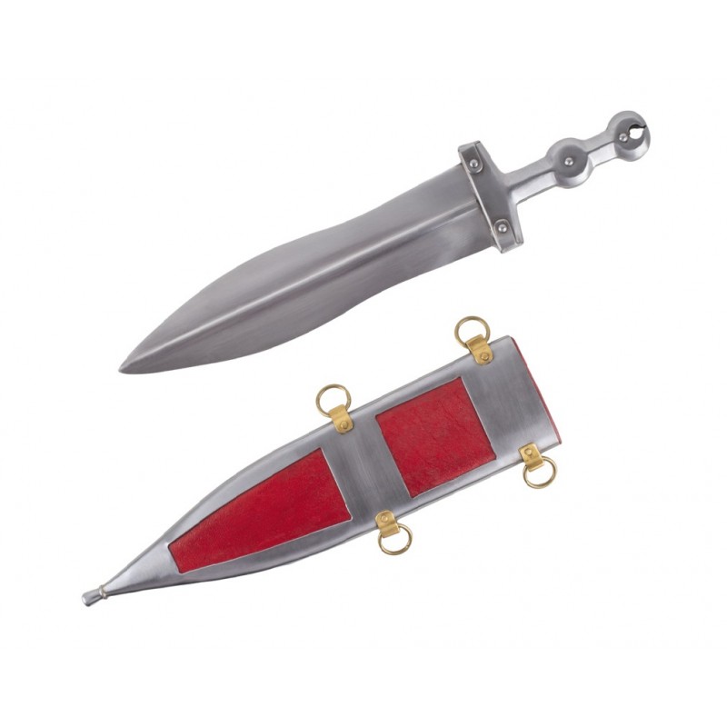 Die Scheide ist aus Stahl gefertigt und mit rotem Leder überzogen. Die Befestigungsringe und ihre genieteten Halterungen sind aus Messing, was der Scheide einen besonderen Hauch von Eleganz verleiht.