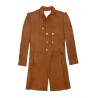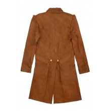 Die Jacke ist aus Wolle gefertigt und mit weichem, weißem Baumwollfutter versehen. Die Knöpfe vorne und hinten sind vergoldet und aus Messing.
