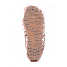 Replik von Caligae-Modellen, die an den Fundstellen von Castleford (Vereinigtes Königreich) und Valkenburg (Niederlande) entdeckt wurden. Die Caligae (Singular: Caliga) waren der typische Militärstiefel, der maßgeblich zu den Erfolgen Roms beitrug, da sie den Legionären ermöglichten, problemlos über unwegsames Gelände zu marschieren – dank der eisernen Nägel in der Sohle. Bei diesem Modell sind die Nägel spitz zulaufend und 7 mm lang. Der Darsteller sollte dies berücksichtigen, wenn er sich auf glatten Oberflächen bewegt, da die Haftung beeinträchtigt sein kann.