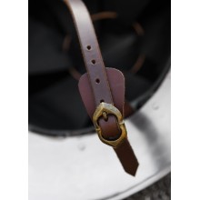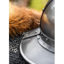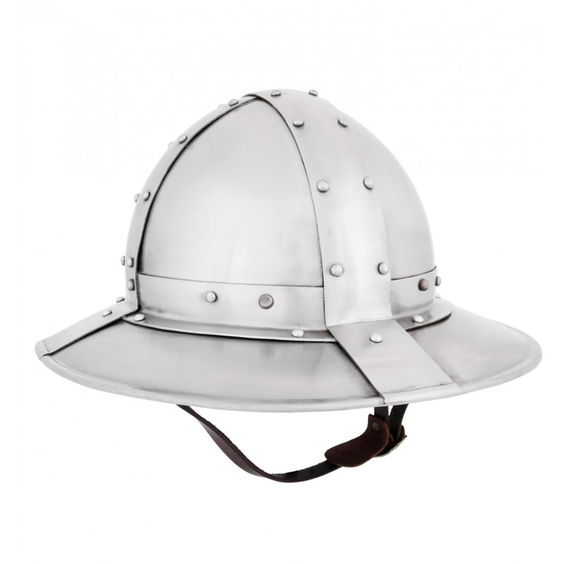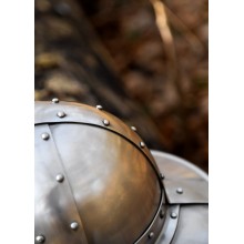 Der Helm besteht aus 1,6 mm dickem Stahl. Die genieteten Stahlbänder sorgen für historische Authentizität und den nötigen Schutz zur Nachstellung jeder Schlacht.