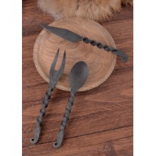 Handgeschmiedetes Besteckset mit Ledertasche.