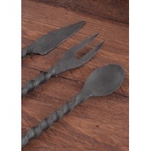 Dieses Set besteht aus drei Teilen: Messer, Gabel und Löffel. Es handelt sich um ein Besteckset aus dem 16. und 17. Jahrhundert, als sich die groben Spieße des Mittelalters weiterentwickelt hatten.