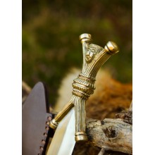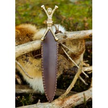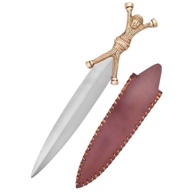 Diese Replik zeigt einen Dolch mit stilisierter anthropomorpher Verzierung am Griff. Römische Soldaten verwendeten solche Dolche, die sie vom Feind erbeutet hatten, als Ergänzung ihrer republikanischen Ausrüstung. Der Dolch besitzt einen Griff aus massivem Messing, eine Klinge aus Stahl und eine einfache, aber robuste Lederscheide.