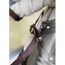 Die beiden Hälften der Rüstung werden um den Körper gelegt und mit verstellbaren 3 mm dicken Lederriemen und Messingschnallen befestigt. Dies ermöglicht eine bequeme Passform für unterschiedliche Größen. Die Riemen und Schnallen sind an den Schultern und an den Seiten fest vernietet.
