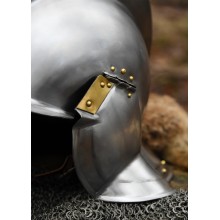 Das hier vorgestellte Modell ist eine meisterhafte historische Replik. Es verfügt über den charakteristischen Kamm der Borgoñoten und ist mit Messingnieten verziert. Die matte Stahloberfläche verleiht dem Helm ein realistisches Aussehen, das von historischen Nachstellern sehr geschätzt wird. Die Wangenklappen sind mit Messingdetails dekoriert und beweglich am Helm befestigt, sodass sie fast 90 Grad nach oben geklappt werden können. Das separat anbringbare Kinnteil (Barbeta) kann je nach Wunsch des Nachstellers getragen werden und ist ebenfalls mit Messingverzierungen und Nieten versehen. Es wird mit einem Riemen am Helm befestigt.