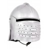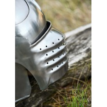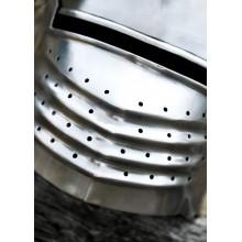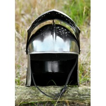 Dieser beeindruckende Helm besteht aus 2 mm starkem Stahlblech, was ihn außergewöhnlich widerstandsfähig und kampftauglich macht („battle-ready“). Das klappbare Visier ist aus 1,6 mm starkem Stahl gefertigt. Zum Lieferumfang gehören ein Lederriemen (Kinnriemen) und ein hochwertiges, vernietetes Innenfutter mit Polsterung.