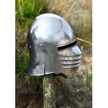 Der Sallet oder „Celada“ ist ein Helmtyp, der gegen Ende des 15. Jahrhunderts aufkam und nach und nach das Beckenhaube ersetzte. Er konnte ein klappbares Visier besitzen oder aus einem einzigen Stück mit Sichtschlitz bestehen. Manche Versionen hatten gar kein Visier (offener Sallet), andere wiederum ein abnehmbares Halsstück (Gorget). Unser Modell unterscheidet sich durch die charakteristische Form seines Visiers – das sogenannte „Blasebalg-Visier“.