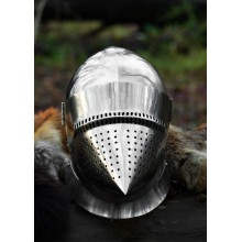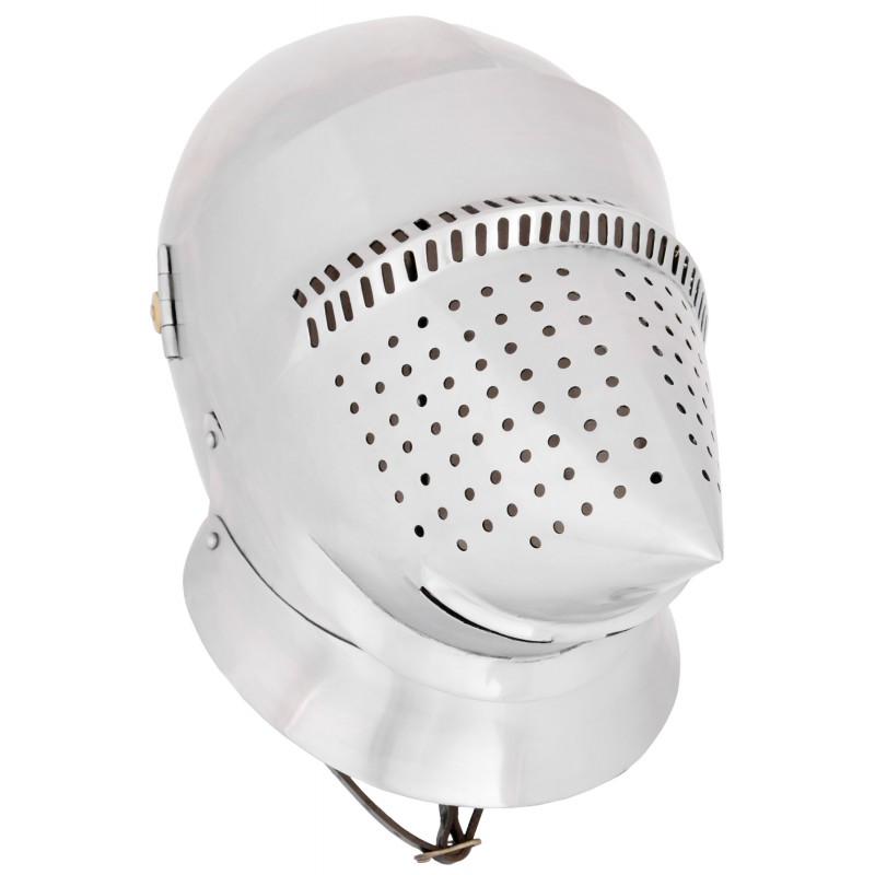 Diese Replik ist etwa auf 1400–1410 datiert und ist von Mailänder Modellen inspiriert, wie viele Helme, die in den Kriegen gegen das Nasridenreich verwendet wurden. Der Helm ist aus 2 mm starkem Stahlblech handvernietet und geschweißt gefertigt. Er bietet aufgrund seiner Robustheit guten Schutz bei jeder Nachstellung von Schlachten (voll battle-ready). Er verfügt über ein klappbares Visier mit Scharnieren sowie zwei Halterungen im Nackenbereich. Außerdem hat der Helm ein bequemes gepolstertes Stofffutter und einen Lederriemen als Kinnriemen. Er wird leicht geölt geliefert, um Korrosion vorzubeugen.