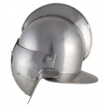 Der Helm besteht komplett aus Stahl und verfügt über ein bewegliches Visier, das das Auf- und Absetzen erleichtert. Innen ist er mit einem verstellbaren Lederfutter ausgestattet, außerdem besitzt er ein Kinnriemen mit Schnalle als Kinnschutz. Zwei Schlitze im unteren Bereich des Visiers ermöglichen das Fixieren der Gesichtsabdeckung mit einer Lederkordel – eine detailgetreue Nachbildung des Originals.