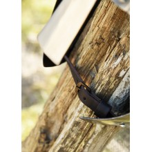 Ein hochwertiges, verstellbares Polsterfutter ist im Helm enthalten. Die beiden Kinnriemen sind aus Rindsleder mit Messingschnallen gefertigt.