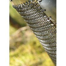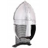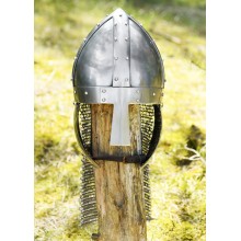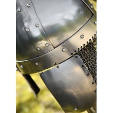 Der Helm verfügt über bewegliche Wangenklappen auf beiden Seiten sowie eine Kettenhaube zum Schutz des Nackens.