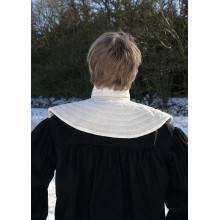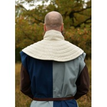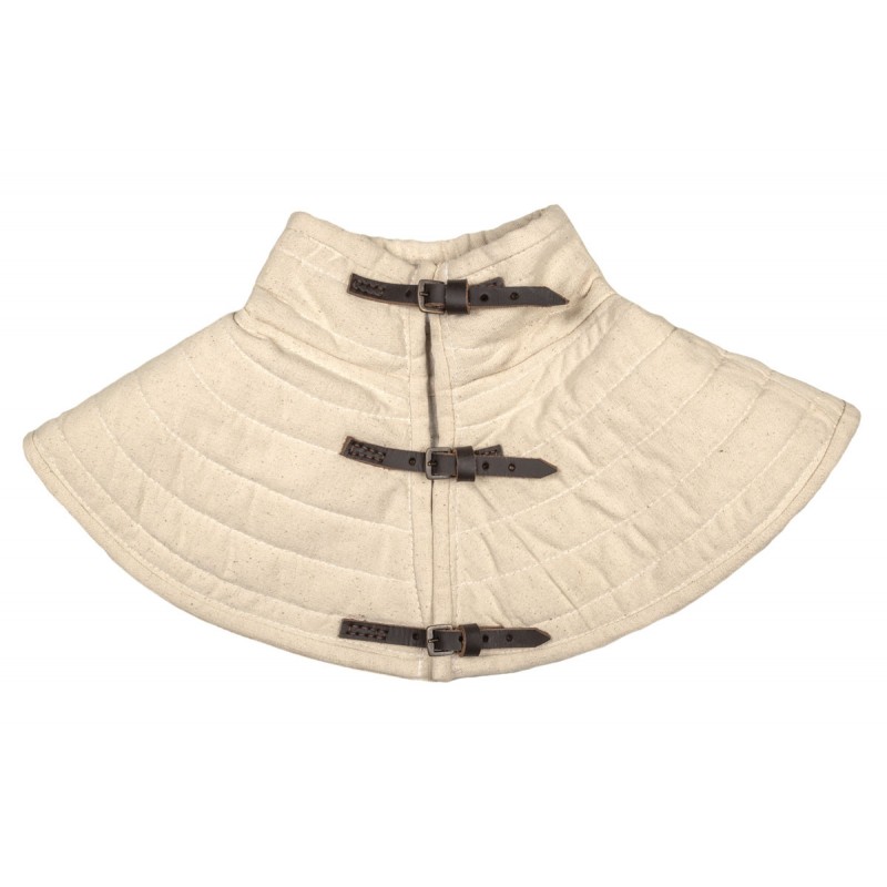 Empfohlener zusätzlicher Schutz zur gepolsterten Kettenhaube. Ideal zum Tragen unter Hauben oder Bischofsmützen aus Kettengeflecht, um Tunika und Haut vor dem Kontakt mit Eisen zu schützen. Drei Lederriemen mit Messingschnallen ermöglichen eine individuelle Anpassung des Kragens an alle Größen. Hohe historische Authentizität dank der verwendeten Materialien – komplett ohne Kunstfasern.
