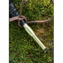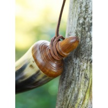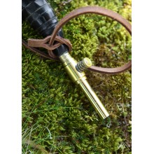 Pulverhorn mit Messing-Dosierauslass und Lederriemen.