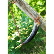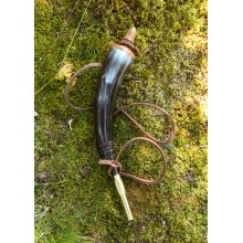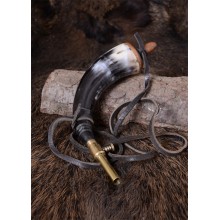 Diese Nachbildung besteht aus echtem Rinderhorn mit eingebautem Messingdosierer. Das hintere Ende ist mit einem Holzdeckel verschlossen. Ein Lederriemen ist zum Tragen über der Schulter enthalten. Da es sich um ein Naturprodukt handelt, können Form, Farbe und Maße leicht variieren.