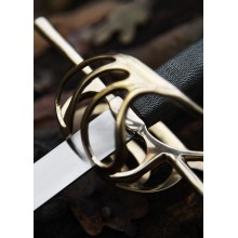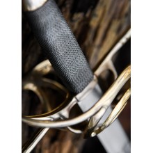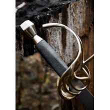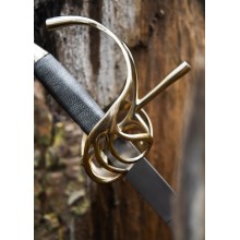 In dieser schönen Replik erkennt man deutlich, wie der Handschutz der Schleifen-Garnitur im Vergleich zu früheren Modellen verstärkt wurde, ohne bereits zur sogenannten „Muschelgarnitur“ überzugehen. Modelle dieser Art waren in der zivilen Welt der ersten Hälfte des 17. Jahrhunderts weit verbreitet.