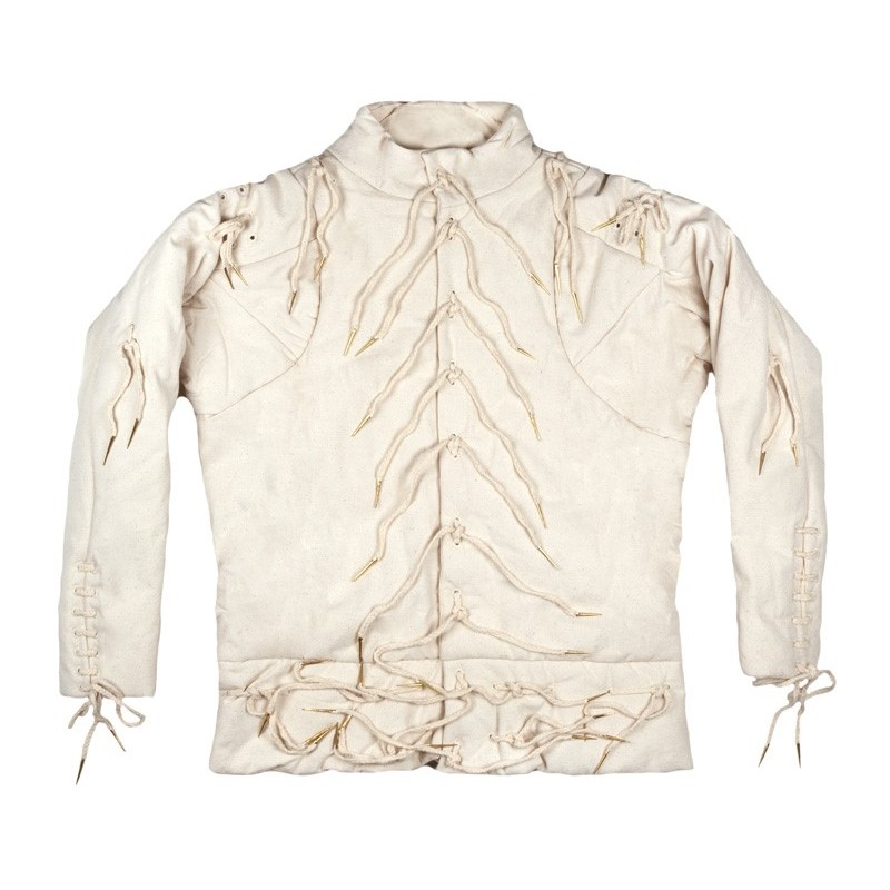 Wir bieten diese Waffenjacke in fünf Größen an. Dank ihres realistischen Schnürsystems ist sie sehr gut anpassbar. Zudem verfügt sie über einige Ösen und Schnüre zum Befestigen von Kettenhemdteilen, z. B. für Armschienen.