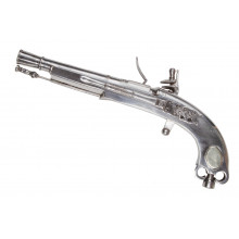 Hochwertige Nachbildung der schottischen Steinschlosspistole, die unter Offizieren der schottischen Highlander-Regimenter Ende des 18. Jahrhunderts weit verbreitet war. Es handelt sich um eine großkalibrige Glattrohrpistole, vollständig aus Stahl gefertigt. Das Originalmodell trägt den Namen seiner Hersteller, Christie & Murdoch, die unter der Leitung von Thomas Murdoch, einem der berühmtesten Büchsenmacher Großbritanniens, arbeiteten. Seit 1730 wurde diese Waffe an schottische Soldaten ausgegeben und gewann in der zweiten Hälfte des 18. Jahrhunderts an Beliebtheit. Gegen Ende der 1790er Jahre wurde sie nicht mehr an die Mannschaft ausgegeben, sondern diente fortan ausschließlich als Ausrüstung von Offizieren oder Unteroffizieren, die sie unter der rechten Achsel mittels einfacher Tragegurte führten.