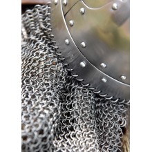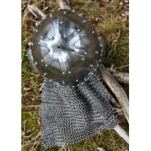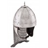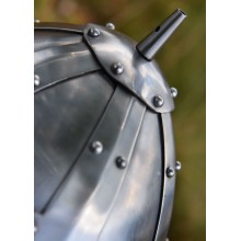 Diese Replik wurde speziell für die historische Darstellung entwickelt und ist aus robustem Stahl mit einer Stärke von ca. 2 mm gefertigt. Der Helm verfügt über zwei Wangenklappen aus Stahl, innen mit Leder ausgeschlagen. Der Verschluss ist vom Typ Baldenheim mit Kinnriemen und Schnallen. Zusätzlich besitzt der Helm eine Helmhaube aus Kettengeflecht mit einfachen Ringen. Ein oberer Dorn kann als Befestigung für Pferdehaar oder andere Helmzierde dienen.