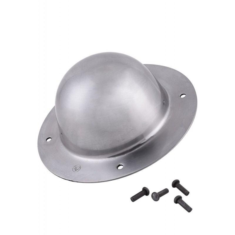 Er wird vorgebohrt geliefert, sodass er dank der mitgelieferten 4 Nieten einfach am Schild befestigt werden kann. Dieser runde Buckel ist voll funktionsfähig. Er hat mittlere Abmessungen, aber ein bemerkenswertes Gewicht für seine Klasse, bedingt durch die 2 mm starke Stahlplatte. Außerdem ist er höher als andere Modelle, ragt weiter über den Schild hinaus, bietet der schützenden Hand mehr Bewegungsfreiheit und erhöht gleichzeitig die offensive Einsatzfähigkeit.