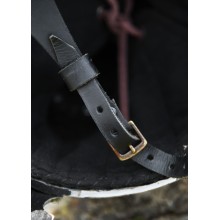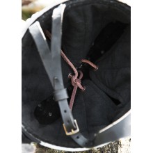 Der Helm verfügt über ein verstellbares Innenfutter, das am Helm angenietet ist. Außerdem ist ein Kinnriemen aus Leder mit Messingschnalle angebracht.