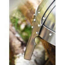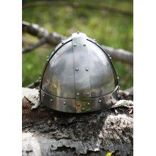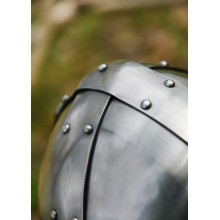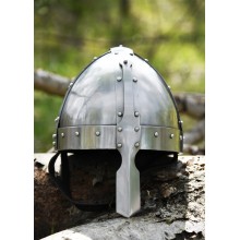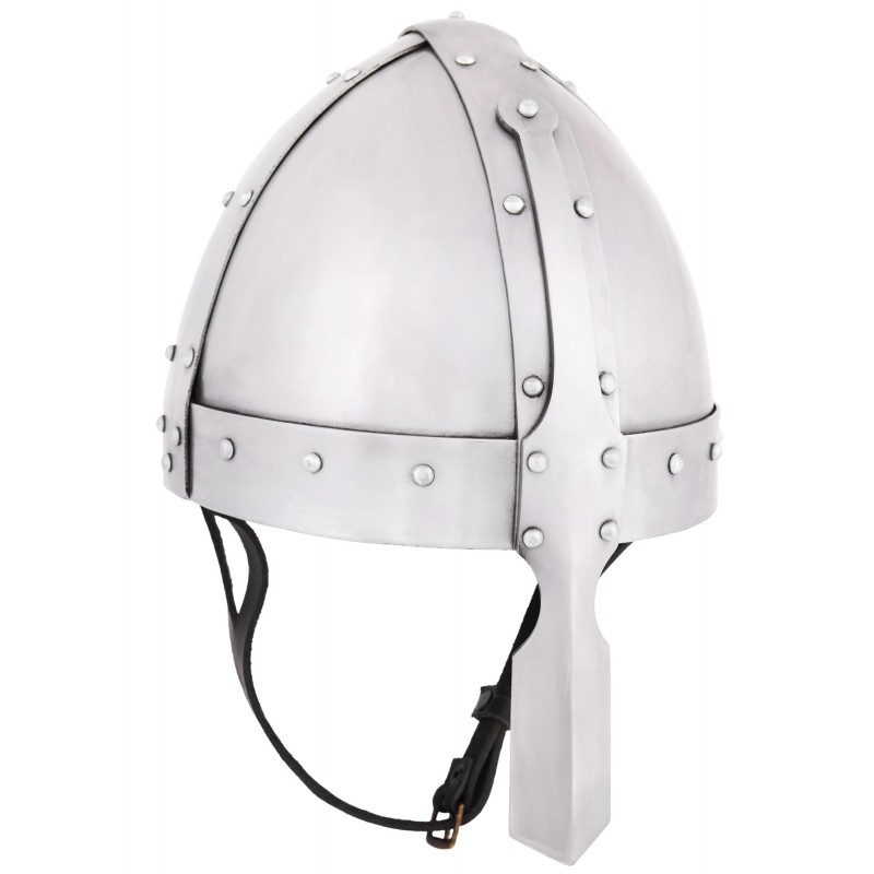 Helme oder Nasalhelme aus genieteten Einzelteilen tauchten im gesamten westeuropäischen Raum gegen Ende des 6. Jahrhunderts auf und blieben bis Ende des 12. Jahrhunderts in Gebrauch, weshalb sie sich gut für historische Nachstellungen dieser Epoche eignen. Modelle wie dieses, bei dem die beiden Helmhälften in der Mitte verbunden sind, reproduzieren spätantike Helme.