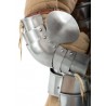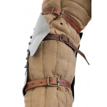 Diese Ellenbogenschützer werden mit Riemen am Arm befestigt. Das Riemensystem ist deutlich stabiler und sicherer als eine Befestigung mit Nesteln, wenngleich nichts den historischen Darsteller daran hindert, zusätzliche Nestelbefestigungen anzubringen, falls er einen Gambeson oder eine Rüstjacke trägt.