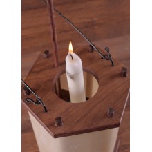 Sehr schöne und authentische Nachbildung einer hölzernen Lagerlaterne. Gefertigt aus Palisanderholz und unbehandeltem Leder (Pergament). Die Laterne besteht aus zwei hexagonalen Holzplatten, die durch Holzstreben miteinander verbunden sind. Die Kerze – beziehungsweise die Tropfschale, in der sie steht – lässt sich mit Hilfe einer zusätzlichen Holzstange nach oben herausziehen. So kann die Kerze leicht angezündet und ersetzt werden. Ein cleveres Design, das bereits im Mittelalter verwendet wurde.