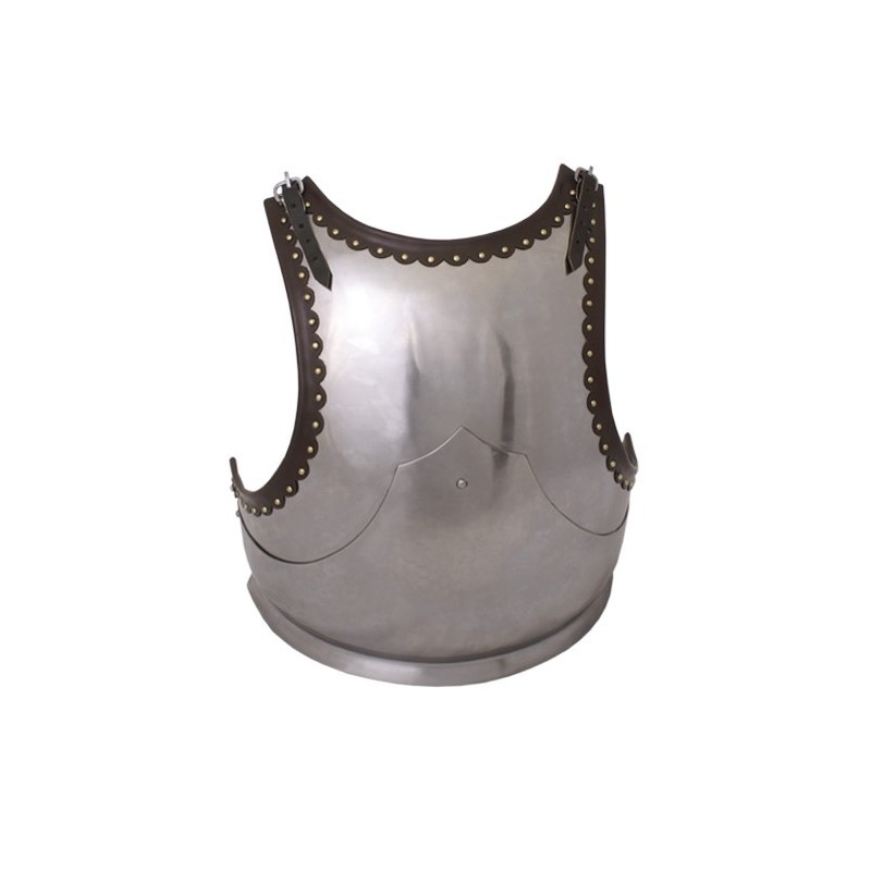Dieses Stück war Teil des Cuirasses, der normalen Panoplie des spanischen Tercios. Der einfache Brustpanzer schützte den Oberkörper des Soldaten, ließ jedoch den Rücken frei. Dies könnte die Wahl des Soldaten gewesen sein, der mehr Leichtigkeit in seiner Ausrüstung bevorzugte, indem er die weniger anfälligen Bereiche nicht schützte. Der Brustpanzer endet mit einer kleinen 'Flügel' -Form, die die Bewegungen erleichterte und gleichzeitig Schläge ablenkte, die vom Oberkörper auf die Beine rutschten, die nicht immer geschützt waren.