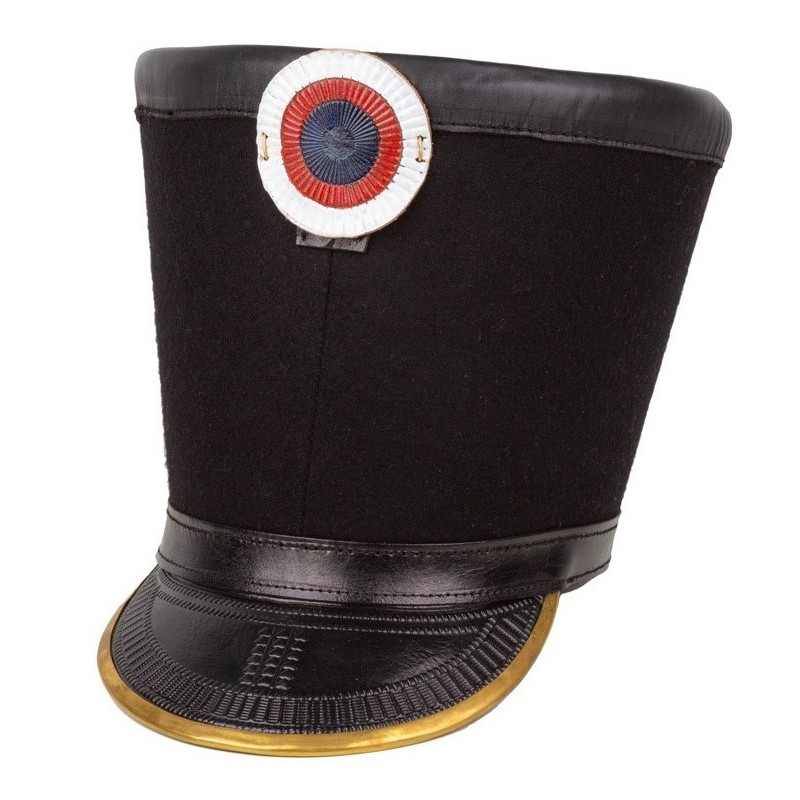 Unsere Nachbildung ist aus Filz und Leder gefertigt. Sie hat eine goldene, aufwendig verzierte Visierkante, die typisch für die Einheiten der Garde und andere Elitetruppen der Grande Armée war.