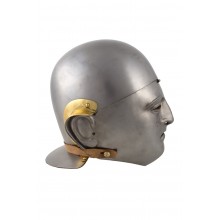 Diese Replik basiert auf dem Fund aus Chassenard, Frankreich, der zwischen 37 und 41 n. Chr. datiert wurde (laut Bishop-Coulston). Das obere Scharnier ermöglicht es, die Maske zu heben und zu senken, die dann mit einem Lederband und den unteren Nieten fixiert wird. In diesem Beispiel sind die Seitenpartien zugunsten einer integraleren Maske, die bis zu den Ohren reicht, verschwunden. Sowohl der untere Teil des Nackenschutzes als auch das Innere der Maske sind mit Leder überzogen. Drei perforierte Löcher an jeder Wange der Maske verbessern die natürliche Belüftung, die auch durch die Öffnungen für Mund, Augen und Nase gewährleistet wird. Die Ohren haben zusätzlich ein Loch zur Verbesserung des Hörvermögens.