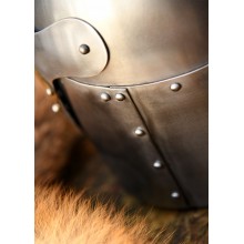 Handgefertigt aus 1,6 mm starkem Stahl mit Messingbeschlägen. Ausgestattet mit einem höhenverstellbaren Lederfutter und Kinnriemen. Erhältlich in normaler und gealterter (patinierter) Ausführung.
