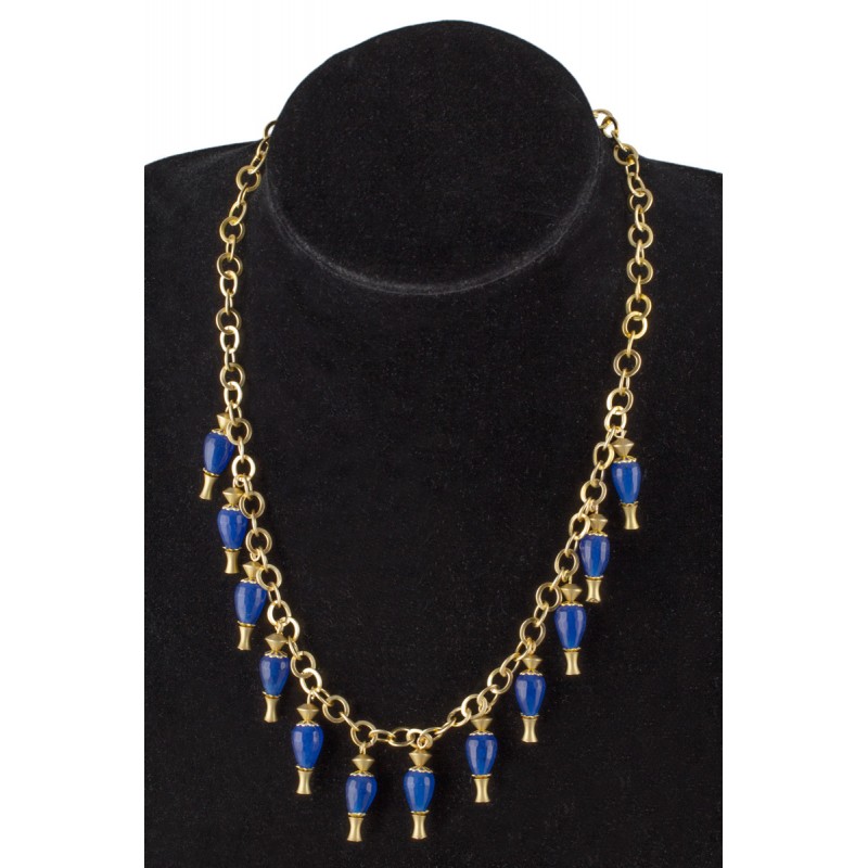 Wunderschöne Halskette mit klassischem Design, inspiriert von etruskischem und griechischem Schmuck. Hergestellt aus Messing und Natursteinen. Die Halskette besteht aus einem feinen Messing-Mesh, an dem elegante Amphoren aus farbigen Natursteinen hängen.