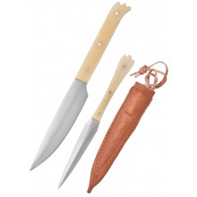Le ofrecemos una amplia selección de réplicas de conjuntos de cubiertos de campaña o viaje medievales en diferentes diseños, formas y tamaños. Este juego de cuchillo y punzón se puede comprar en tres versiones del mango: madera, cuerno o hueso.
