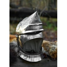 Esta reproducción puede datarse alrededor de 1400-1410 y es de inspiración milanesa, como muchos cascos presentes en las guerras contra el reino nazarí. El casco está hecho de chapa de acero de 2 mm de espesor, remachado y soldado a mano. Asegura una buena protección debido a su robustez durante la recreación de cualquier batalla (completamente battle-ready). Tiene una visera plegable con bisagras y también dos soportes en la zona del cuello. Además, el casco tiene un cómodo forro de tela acolchada y una correa de cuero como barboquejo. Se entrega ligeramente aceitado como medida anticorrosión.