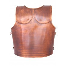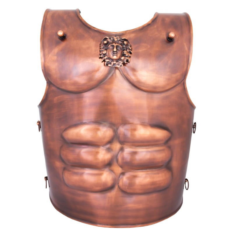 Esta reproducción de lorica musculata, algo más corta y manejable que otras réplicas, recrea una musculata de bronce, con los múculos de pecho y vientre muy marcados. Tiene un estilo helenístico, muy del gusto romano, lo que resalta por su decoración con una cabeza de medusa en la parte frontal superior y por sus hombreras. Consigue una historicidad y rigor excelentes, tanto por su sistema de cierre superior medieante encastre en perno, como por los cordones de cuero que fijan los cierres laterales (vinculum). Esta lorica musculata es un elemento ideal para recrear legados o tribunos senatoriales.
