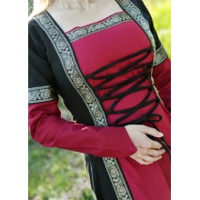 Por lo tanto, estamos ante un precioso vestido medieval con capucha puntiaguda. Los lazos delanteros y traseros garantizan un ajuste perfecto a la silueta femenina. Las mangas del vestido están ligeramente acampanadas, muy del gusto de la época. La combinación de colores y el ribeteado de adorno hacen que el vestido sea excepcional y encantador.