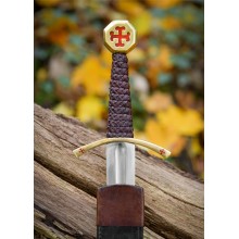 Dagamedievalcon pomo octogonal y cruz potenzada (cruz de Jerusalén) en rojo esmaltado, lo que podría indicar su uso por alguna familia noble que se preciara de haber participado en las expediciones de Tierra Santa. En la Reconquista esta tipología de cruz es muy utilizada, tanto en pomos de dagas y espadas, como en otro tipo de armamento y heráldica.
