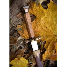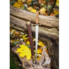 Cette belle réplique que nous proposons ici est basée sur un original du début du XVIe siècle (environ 1510-1540) qui appartient à la collection du Metropolitan de New York. La lame est en acier à ressort EN45, a une section transversale en diamant et se rétrécit en une pointe acérée. Les arêtes de coupe ne sont pas coupantes et la tige est vissée dans le bouton (écrou supérieur). La garde et le pommeau de conception artistique sont en laiton vieilli et la poignée elle-même est sculptée dans du bois. La garde comporte de petits faucons légèrement évasés et un anneau latéral en forme de B, et le pommeau hexagonal s'évase en un couvercle plat et orné.